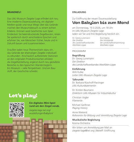 Unsere Mitglieder sind herzlich eingeladen mit dabei zu sein, wenn am 19. März 2026 die neue Dauerausstellung eröffnet wird. Wir bitten um Anmeldung per Mail an ziegelei-lage@lwl.org mit dem Betreff "Eröffnung".