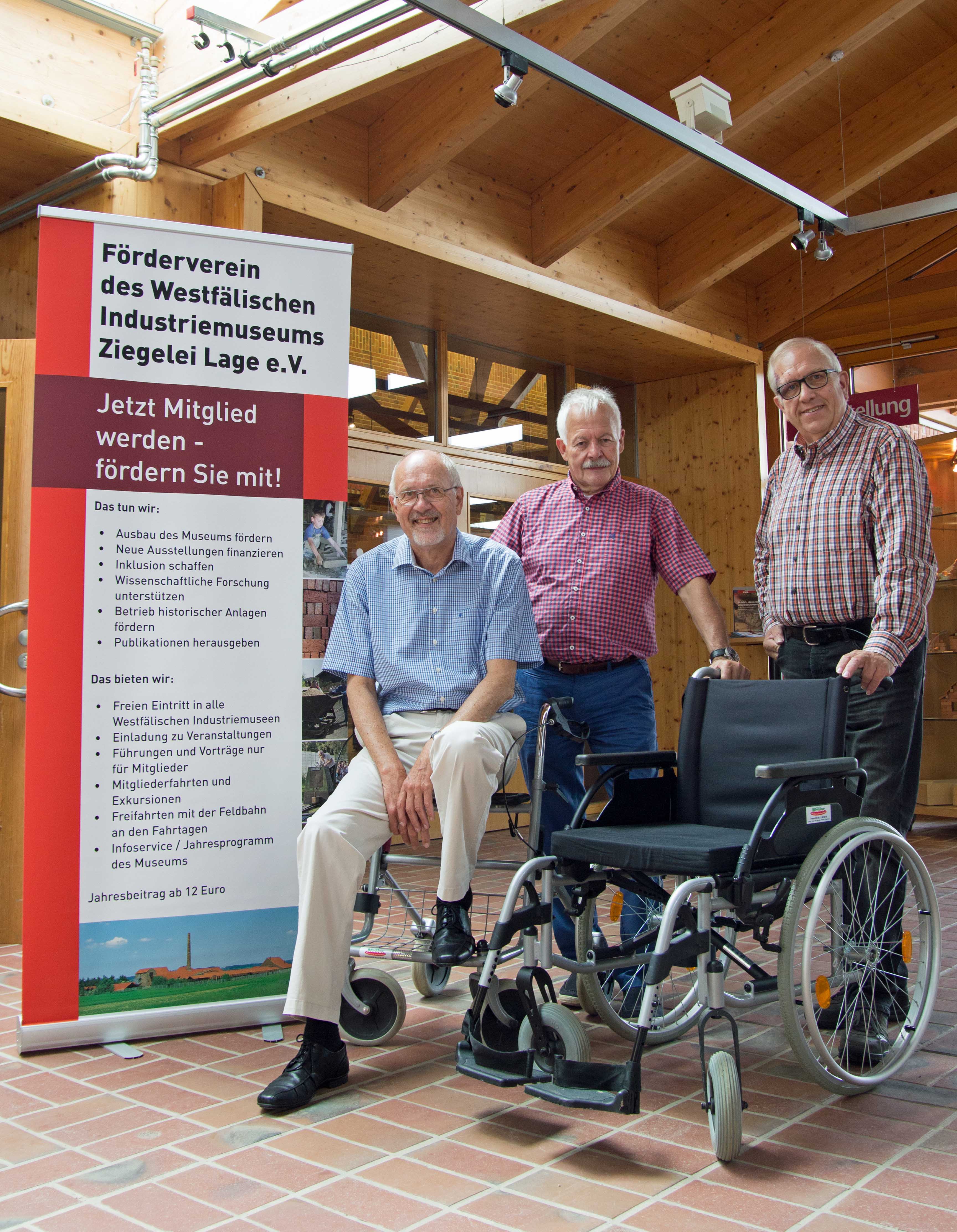 Zum Foto: Zum Abschluss der Arbeiten am barrierefreien Zugang zum Maschinenhaus stellten Axel Kümper (links) und Reinhard Weber (rechts) vom Vorstand des Fördervereins Ziegelei Lage und Museumsleiter Willi Kulke den neuen, ebenen Zugang vor, der sich mit seiner gelben Farbe ins neue Leitkonzept des Ziegeleimuseums einfügt.